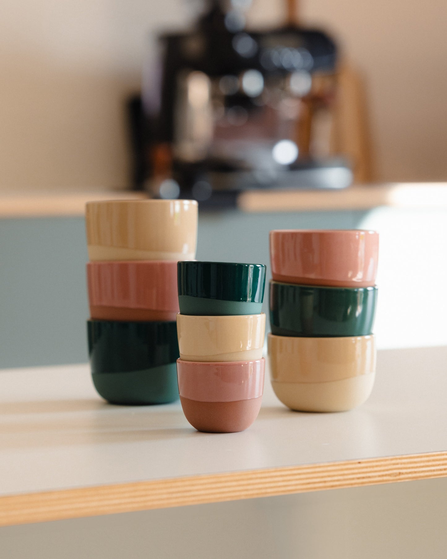 Het resultaat? Deze prachtige, half geglazuurde cappuccino kopjes in 3 bijzondere kleuren. Staan gegarandeerd mooi op je machine en je koffietafel.
