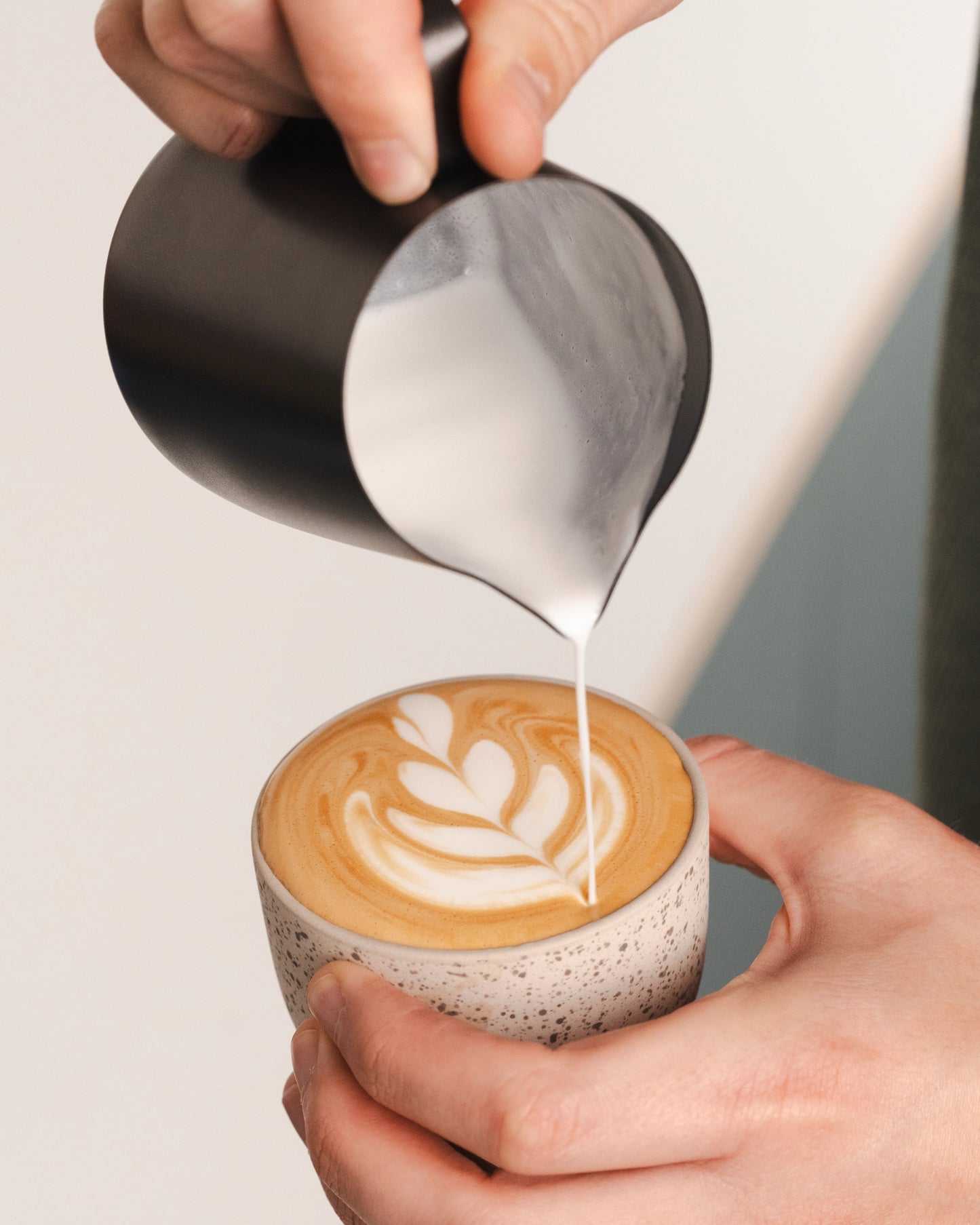 Door het smalle tuitje en de ergonomische vorm neem je controle over je latte art.