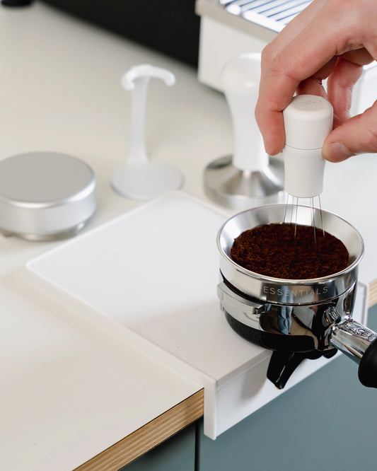 Dit moest snel anders, en dus gingen we bij Barista-Essentials op zoek naar een oplossing. We vonden veel tamping matten in de gekste vormen en met speciale ruimtes voor je tamper (alsof je geen andere barista tools hebt).