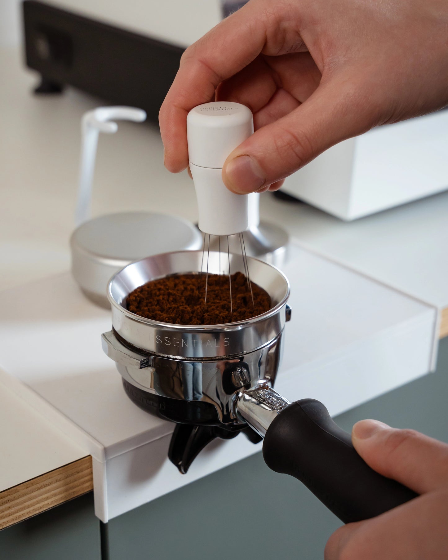 Na het malen roer je met deze tool door de koffie (zorg dat je doseerring er nog op zit). Zo breek je alle klontjes en verdeel je de koffie perfect voor het tampen. En geloof me: dit maakt meer impact dan je denkt.